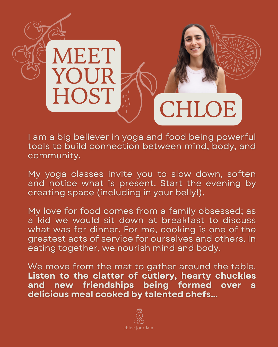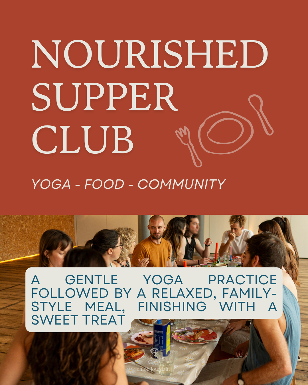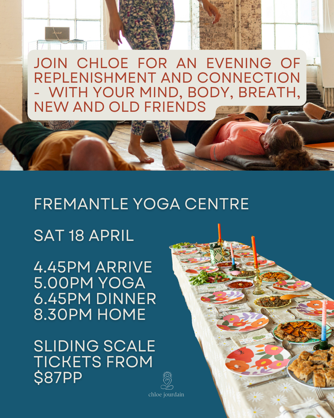 *This is a private event and tickets are available here: https://www.chloejourdainyoga.com.au/book/p/nourished-supper-club-18-april-2026