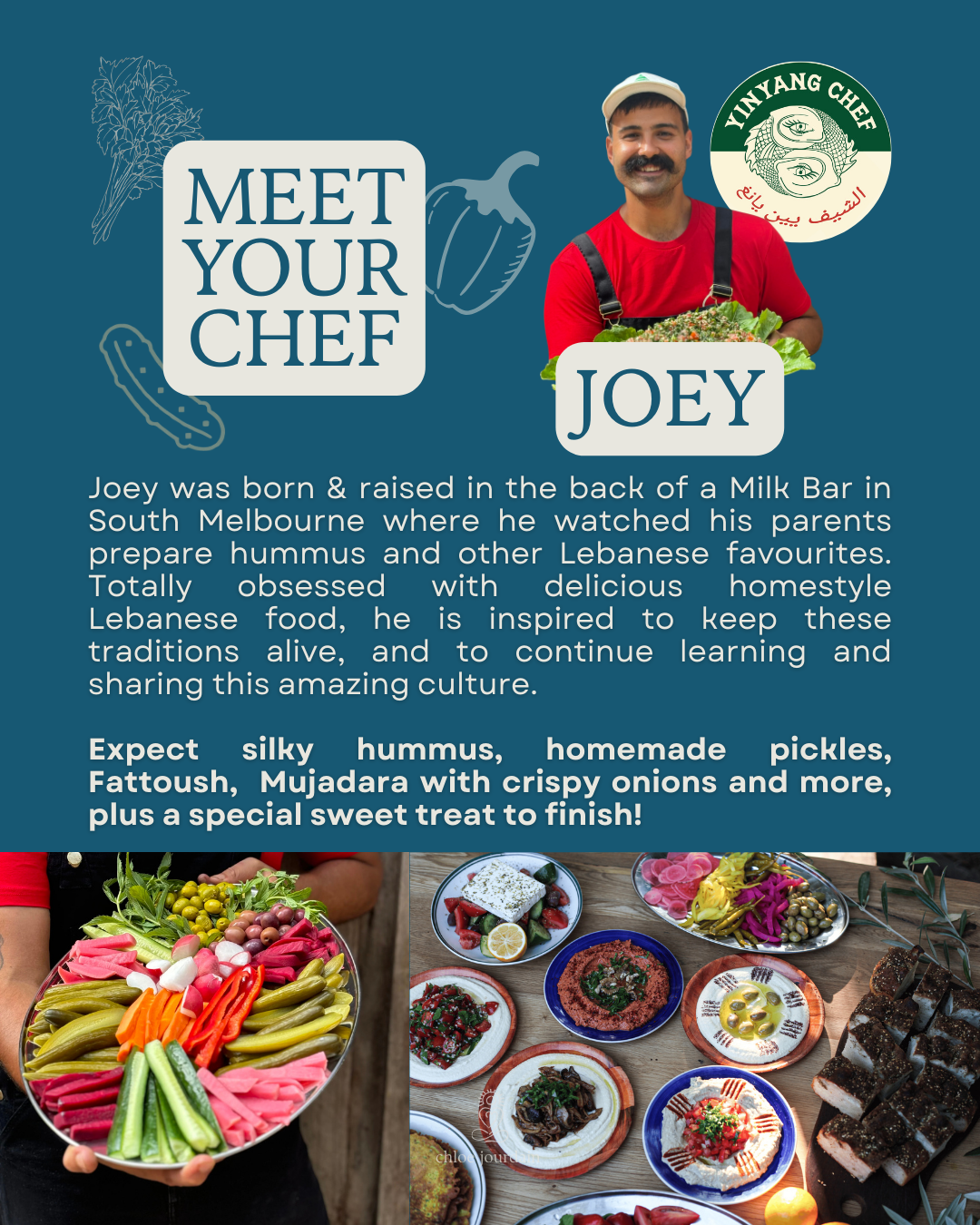 For our first supper club, dinner will be lovingly prepared by Joey of YinYangChef. Expect silky hummus, homemade pickles, Fattoush, Mujadara with crispy onions and more, plus a special sweet treat to finish!